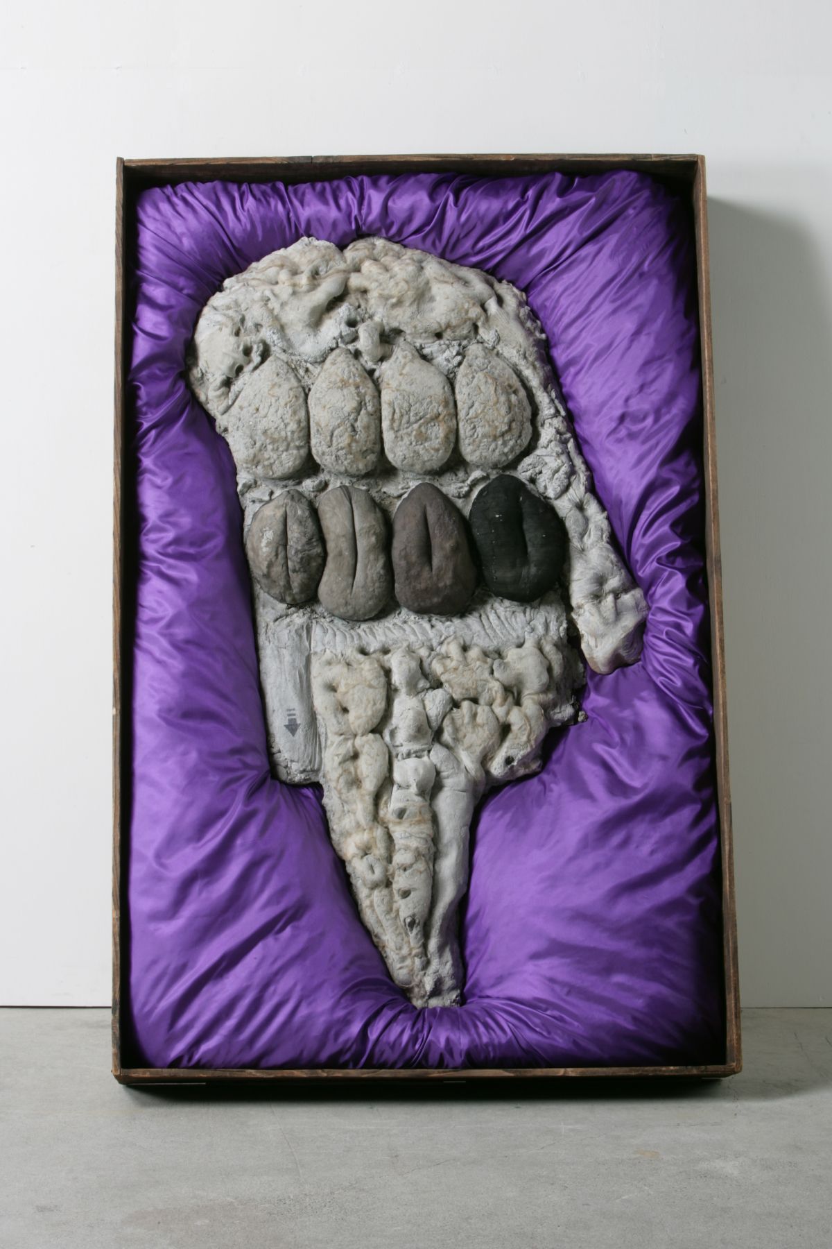 It is a coffin or coffin-like box, the lining of which is a shiny fabric, dark in color